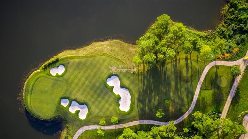 🌟 11번 홀 (Par 3, 150야드) 또 다른 시그니처홀은 11번 홀입니다. 그린 전체가 호수 가운데 섬처럼 떠 있는 아일랜드 그린 홀인데요. 보는 것만으로도 긴장감이 넘칩니다. 바람의 방향과 세기를 정확히 파악하는 것이 가장 중요합니다. 혹시라도 물에 빠뜨리면, 벌타와 함께 씁쓸한 기분까지 느껴야 하니, 온그린에만 집중하는 것이 좋습니다. 다행히도 그린이 넓은 편이라, 안정적인 샷만 구사한다면 충분히 파 세이브가 가능합니다.